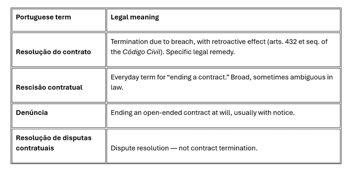A contract that uses resolução when it means denúncia — or reaches for rescisão because it sounds right — may not be enforceable as intended. A Portuguese court, or a Portuguese counterparty’s lawyer, will read the term according to its legal meaning in the Código Civil. If the wrong term is there, the document does not say what you think it says.